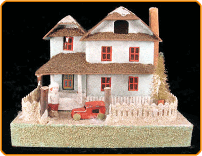 This image couresy of the Papa Ted's Place Archive at CardboardChristmas.com.  Used by permission.These houses were flocked with a shredded-looking material that, according to collector Barbara Lovejoy, looked a lot like the kind of shredded coconut used on cakes and other deserts. No, it wasn't edible. But it was attractive and interesting. The bad part was that it did not hold up well, so many collectors found houses that were in otherwise good shape with half or more of the flocking material missing. (For the late Ted Althof's original description of "coconut" houses, click here. If you're at work, mute your computer first - Ted liked to put music tracks on his pages.)
